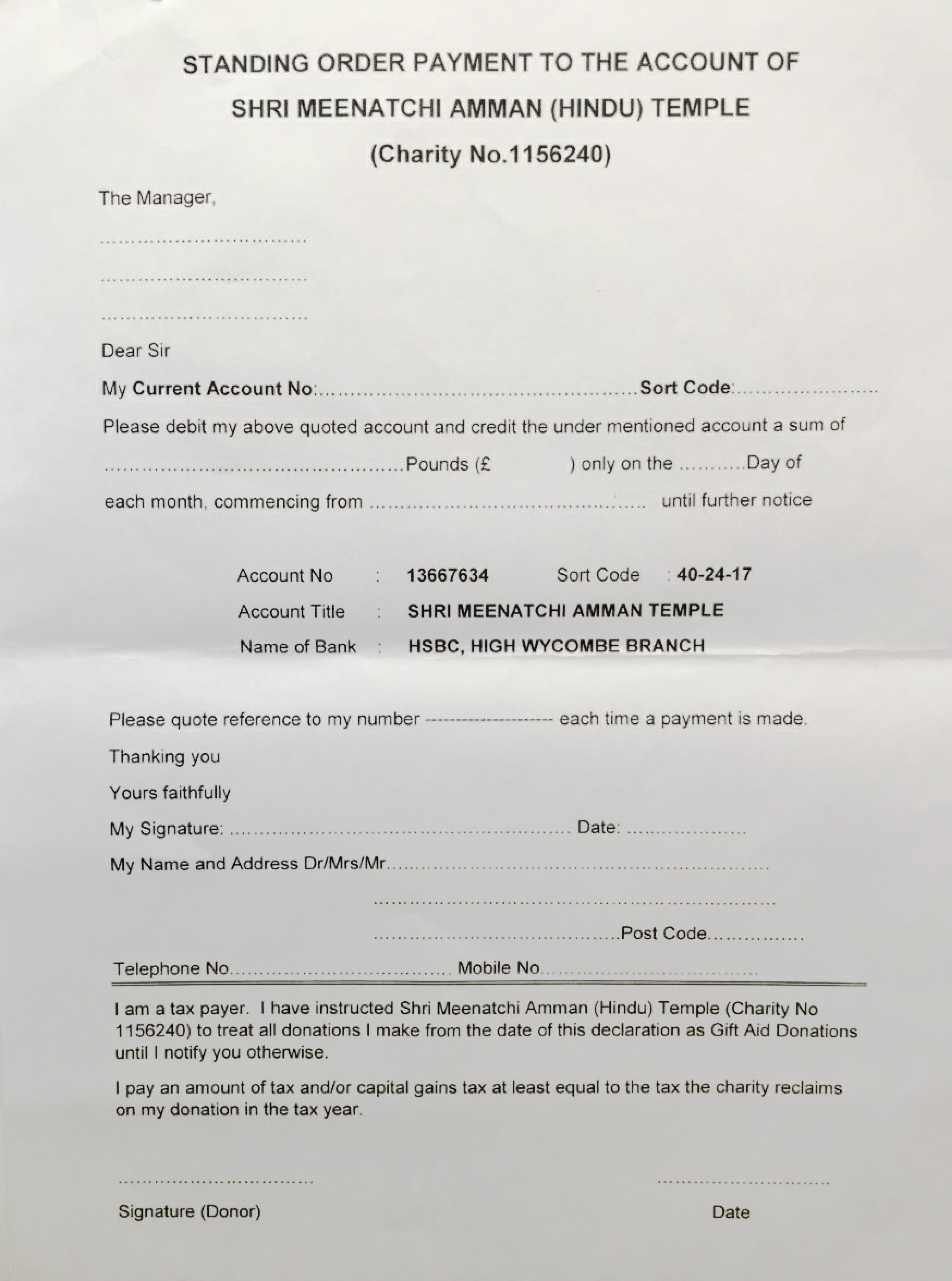 Standing Order Mandate - Standing Order Form